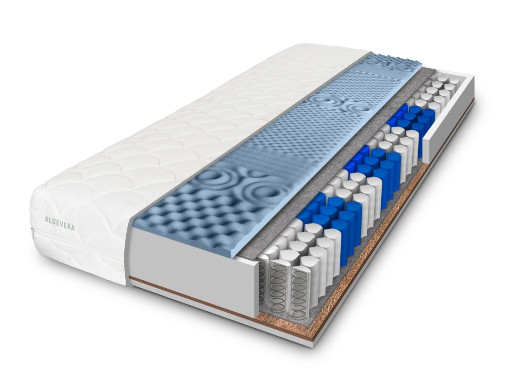 Prešívaný poťah s Aloe Vera a dutými vláknami zabezpečuje výbornú priedušnosť a komfort. Jeho hypoalergénna úprava a antibakteriálne vlastnosti sú ideálne pre alergikov. Aloe Vera prináša pocit hebkosti a blahodarný vplyv na pokožku. Poťah je možné jednoducho prať pri 60 °C bez potreby sušenia alebo žehlenia. Pre vyššiu hygienu lôžka odporúčame použitie chrániča matrace, ktorý uľahčí údržbu.